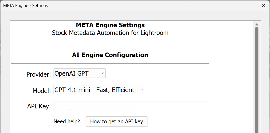 I’m setting up META Engine (a Lightroom Classic plugin) and I need an API key.