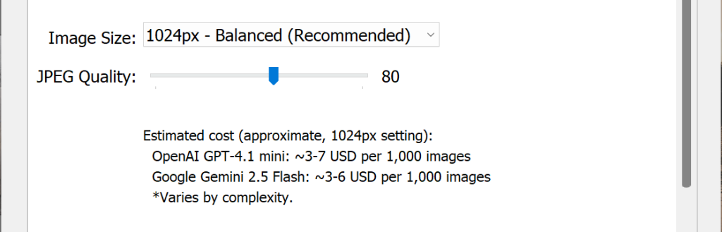 Lower settings = cheaper and faster. Higher settings = potentially more accurate scene interpretation. Higher settings also increase the data sent to the AI provider, which can increase usage cost.