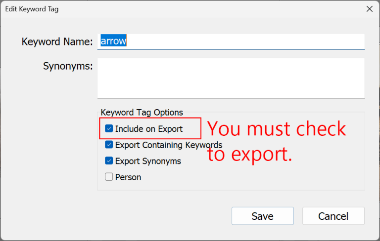 If keywords are generated correctly but missing from exported files, the cause is usually Lightroom’s Include on Export property.