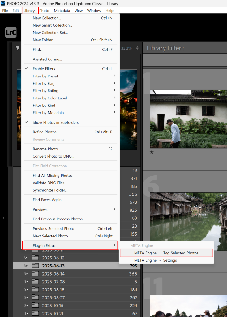 Library→Plug-in Extras→META Engine - Tag Selected Photos - Confirm keywords appear in the Keyword panel