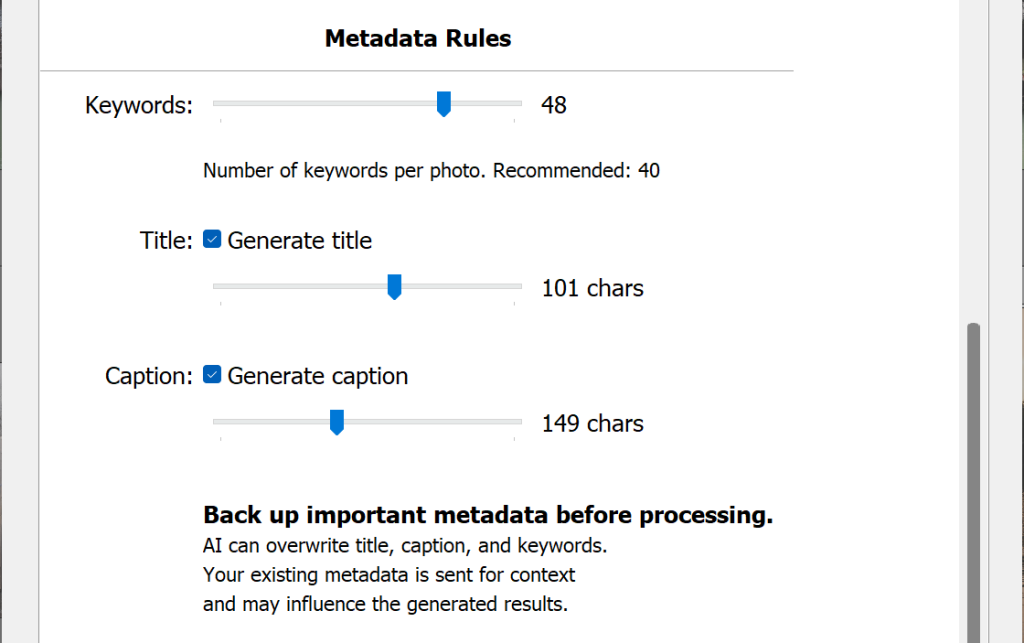 However, the AI may rephrase, reorganize, or not preserve exact wording. If exact wording matters, disable Title/Caption generation or back up your metadata first.