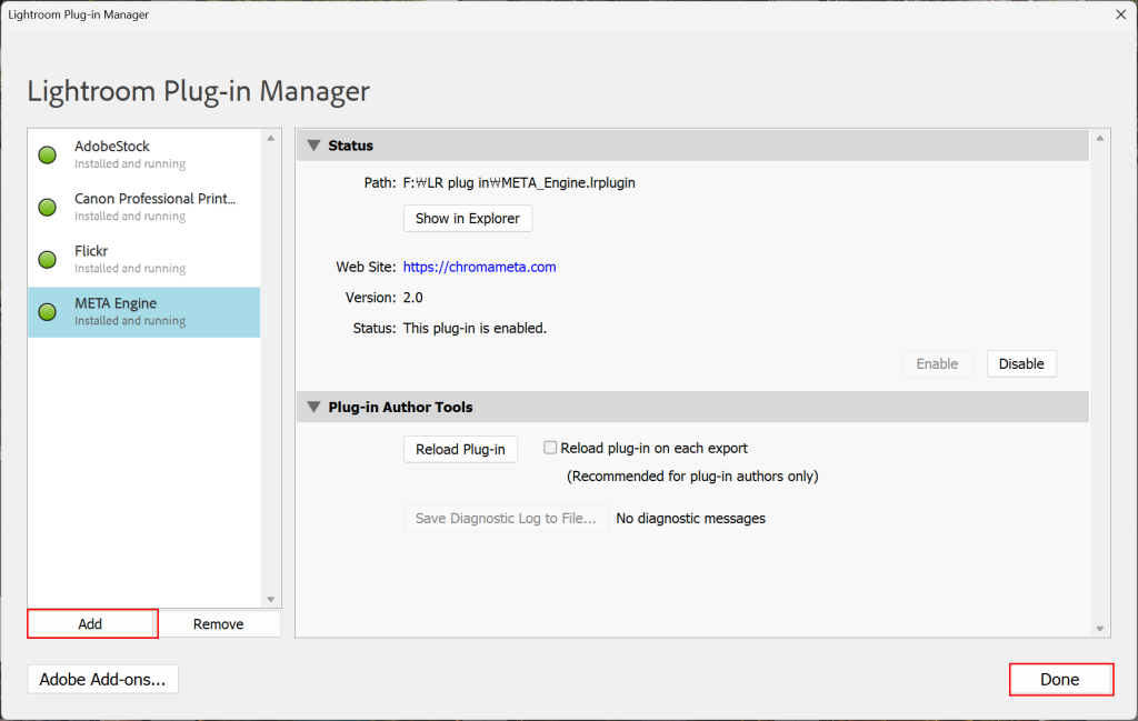 META Engine should appear listed and active in Plug-in Manager. If Lightroom reports the plugin is blocked or not loaded, restart Lightroom Classic once.